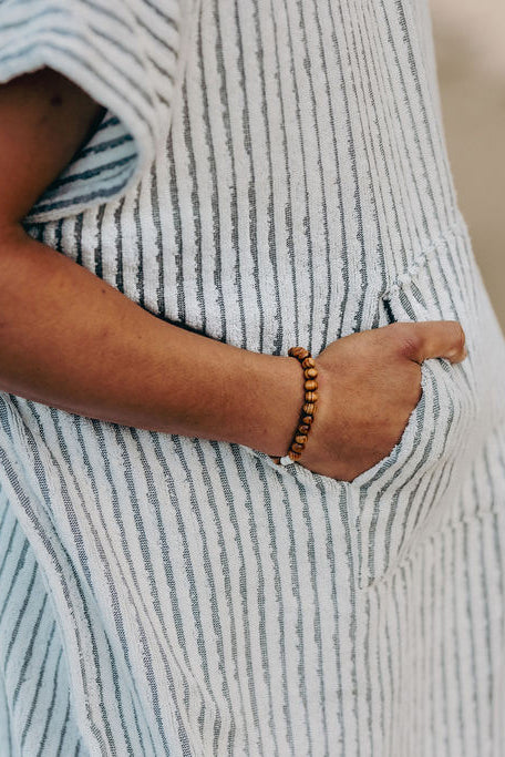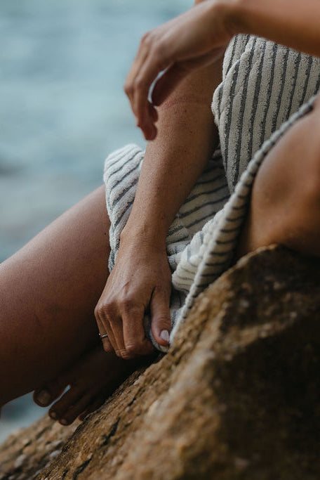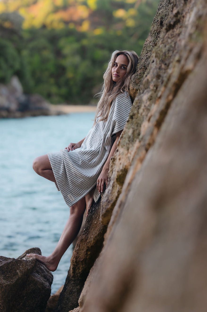 Made from 450gsm organically grown Turkish cotton, this poncho is beautifully soft with a subtle woven stripe running through the lush terry towelling. Highly absorbent and wonderfully warm, it's designed with generous width so you can comfortably get changed underneath (see sizing below). Perfect for beach days, post swim warm ups, or throwing on for the drive home.