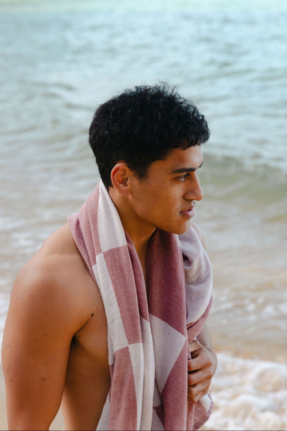 Made from 100% recycled cotton, these towels are lightweight and designed with a flat weave in a swirly check. This weave makes them highly absorbent, quick drying and less bulky than regular terry towels. Making them the perfect accompaniment for travel, beach days or by the pool.